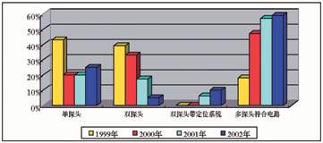 圖1 所示從1999年到2002年(2002年的數據是由上半年數據推算而來)單探頭、雙探頭、雙探頭帶定位系統和多探頭符合線路,四種不同核醫學設備每年各種類型所占比例。可以看出。最為明顯的是普通雙探頭在2002年僅僅占總數的5%,普通單探頭占總數25%,多探頭帶符合電路系統占總數59%。普通雙探頭帶X線定位系統占總數10%。可以看出單探頭SPECT和多探頭符合電路系統呈增長趨勢,尤其以多探頭符合電路系統更為明顯。