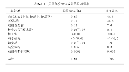 常用的測量單位是倫琴,戈瑞(Gy)和希沃特(Sv).倫琴(R)是空氣中x或γ電離輻射的計(jì)量單位,戈瑞是被各組織或物質(zhì)吸收的能量計(jì)量單位,它可應(yīng)用于各類輻射.R和厘戈瑞(cGy)基本上是相等的.在說明生物學(xué)效應(yīng)時,Sv與經(jīng)質(zhì)量因子校正的Gy相等.因?yàn)閷σ欢康哪芰慷?不同類型的輻射可產(chǎn)生不同的生物學(xué)效應(yīng);例如,中子有較大的效應(yīng).對X和γ輻射,Sv與Gy相等.在現(xiàn)代術(shù)語中Gy和Sv已替代拉德(rad)和雷姆(rem),Gy=100rad,Sv=100rem.在非專業(yè)刊物中常常將輻射分為低水平輻射(0.2~0.3Gy)和高水平輻射(>0.3Gy).而醫(yī)學(xué)劑量一般為<0.05Gy,而且常常<0.01Gy.地球及其大氣的本底放射活性水平很低,而不能測知其效應(yīng)(表278-1).